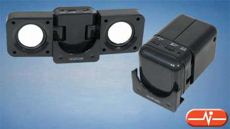 Estos altavoces plegables y portátiles trabajan con baterías para que puedan ser usados en cualquier sitio. Son aptos para cualquier dispositivo de audio con conexión jack de 3,5”, especialmente reproductores de MP3, ya que pueden ser insertados en el frontal de los altavoces.