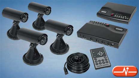 Kit de vídeovigilancia compuesto por una unidad cuádruple de control, cuatro cámaras color CCTV con leds de infrarrojos, cables de hasta 8,5 metros y mando a distancia. Este kit es ideal para instalar un sistema de seguridad u observación. La unidad de control de las cuatro cámaras permite seleccionar distintos modos de visualización, incorpora alarma, ajuste de brillo y contraste individual para cada cámara.