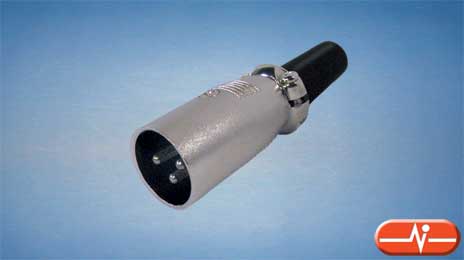 Conector XLR macho de tres pines en metálico con anclaje de seguridad.