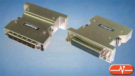 Adaptador SCSI externo con conector macho HPDB50 con enganches y otro conector hembra DB25 fabricado con carcasa plástica de color plateado.