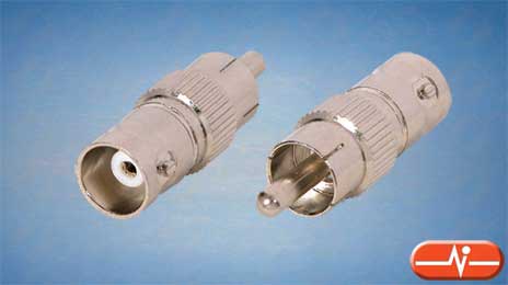Adaptador de audio con conector hembra BNC y conector jack macho RCA.