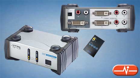 Podrá conectar las salidas de audio estéreo y vídeo de varios dispositivos con salida DVI a un proyector o monitor DVI, conmutando con pulsadores o con el mando a distancia por infrarrojos.