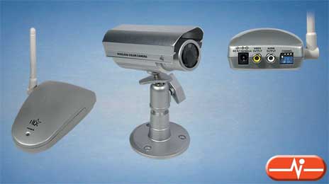 Sistema de seguridad Wireless formado por una cámara preparada para la intemperie equipada con micrófono y visión nocturna. Puede ser usado tanto en interior como en exterior. Transmite audio y vídeo a una distancia de 100 metros en exterior y 30 metros a través de muros interiores.
