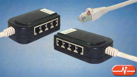 Adaptador RDSI cerrado a través de dos resistencias de 100 Ohmios. Dispone de 1 entrada RJ45 macho y 8 salidas RJ45 hembra.