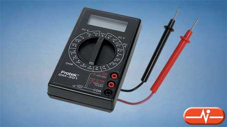 Multímetro digital de bolsillo con cinco funciones de medición y testeo para diodos. Dispone de una pantalla con tres dígitos para mostrar el resultado de las mediciones.
