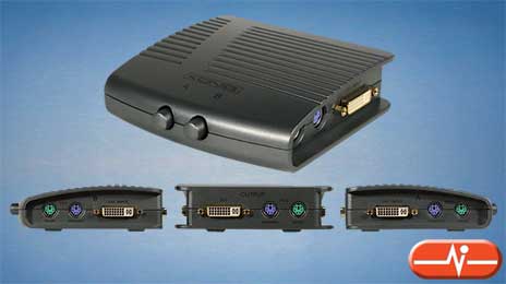 Controle dos PC's con un solo monitor, con conexión DVI, teclado y ratón PS/2 usando este conmutador manual. Pulsando los botones del frontal es posible cambiar entre los dos PC's, un par de led's le indicarán cual de los dos PC's esta seleccionado en cada momento.