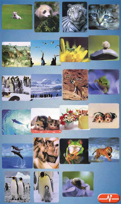 MPI 086: Cara de gato. MPI 087: Jirafas en la sabana. MPI 092: Gaviotas volando sobre unos hombres. MPI 123: Saltamontes sobre flor. MPI 126: Ratón sobre ratón. MPI 127: Grupo de pingüinos. MPI 128: Pingüinos y mar helado. MPI 131: Caracol sobre una flor violeta.