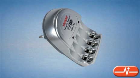 Cargador de pilas recargables para los tipo AA y AAA, incorpora dos circuitos de carga con led indicador carga individual. Selecciona automáticamente el tipo de carga según la pila insertada.
