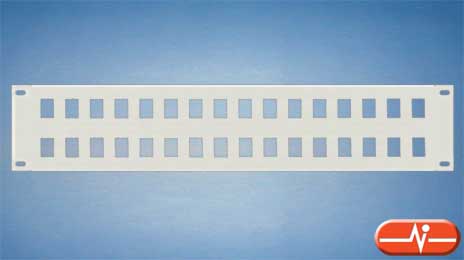 Panel frontal para armario Rack de 19” con 32 huecos tipo AMP para conectores hembra de RJ45, RJ12 y RJ10. Está disponible en dos unidades de altura.