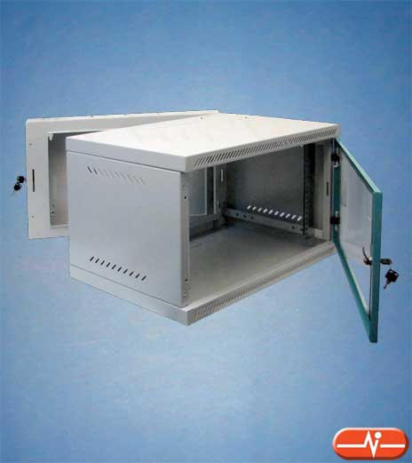 Armario mural de dos cuerpos, con puerta frontal en cristal color bronce equipada con cerradura. Con 2 perfiles frontales de 19", ranuras frontales de ventilación, tapas superior e inferior desmontables que permiten la entrada de los cables. Estos armarios se ofrecen en 6U, 9U, 12U y 15U.
