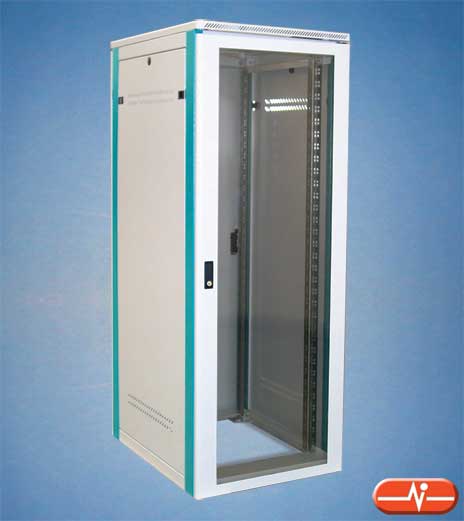 Rack de 19" con puerta frontal en cristal color bronce, equipada con cerradura, con 4 perfiles desplazables de 19", puerta trasera en chapa de acero con llave y panel trasero inferior para permitir la entrada de cables. Los paneles laterales son desmontables y el techo posee ranuras de ventilación. Incluye cuatro patas regulables en altura. Se ofrecen en distintas alturas, desde 33U hasta 42U.