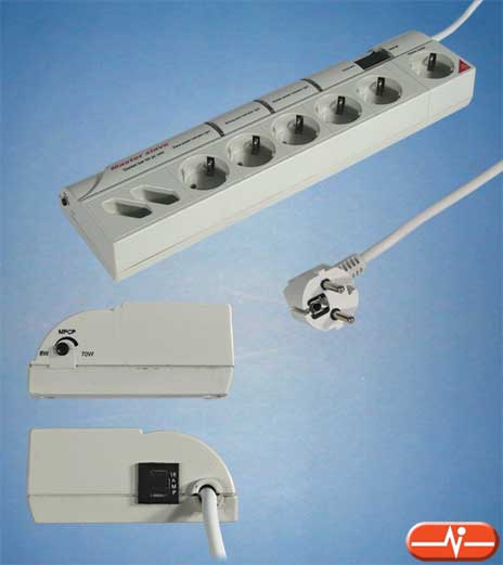 Regleta de protección para ocho tomas con interruptor y sistema maestro-esclavo. Se puede ajustar el nivel de sensibilidad para las sobretensiones del soporte maestro.