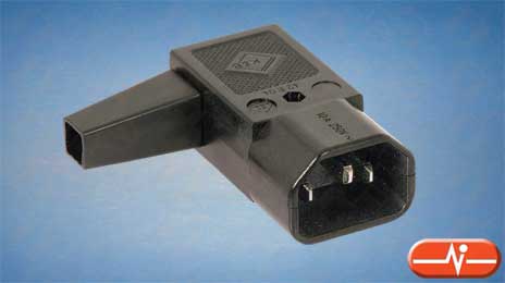 Toma para ordenador de 220 V acodada a la derecha con conector IEC 320-C14 macho de 3 pines. Carcasa ensamblada de color negra.