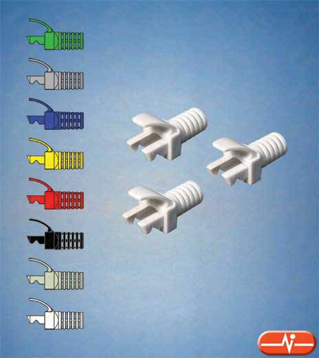 Refuerzos RJ-45 con un diámetro de 5,5 mm. ABS/PVC. Estos refuerzos fuertes y compactos ofrecen, además de una identificación sencilla y protección del cable de transferencia, un aspecto muy profesional pues parece que son moldeados al tener el refuerzo en color blanco y la parte delantera del mismo en diferentes colores.