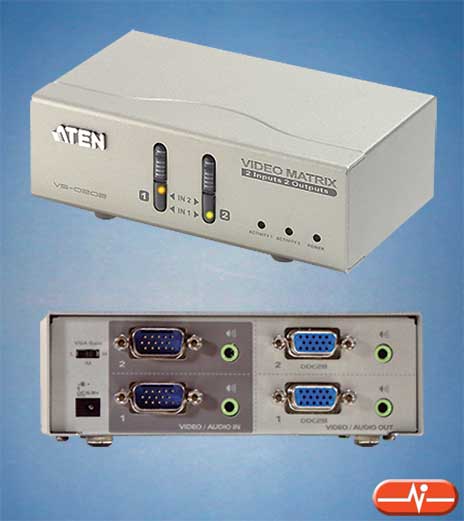 Conmutador Matrix de VGA que permite mostrar la señal de vídeo de varios equipos en varios monitores pudiendo seleccionar que equipo se va a ver en cada uno de los monitores, proyectores y altavoces, ya que también tiene soporte para audio estéreo. La distancia máxima a la que se puede transmitir dichas señales es de 65 metros de longitud con un ancho de banda de 300 Mhz. Soporta conexión en cascada. Es un dispositivo ideal para presentaciones en las que se debe mostrar información de múltiples equipos en distintos destinos. Disponible para dos o cuatro equipos a dos o cuatro monitores.