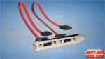 Soporte en bracket con dos conexiones S-ATA. Permite transformar dos conexiones internas de la placa base en externas en la parte trasera de la CPU para poder conectar, así, cualquier dispositivo S-ATA externo.
