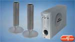 Altavoces 2.1 con subwoofer, con un atractivo diseño. Los altavoces satélite tienen forma tubular, con un aspecto metalizado