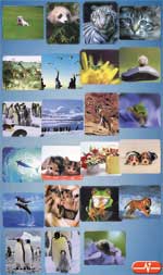 MPI 086: Cara de gato. MPI 087: Jirafas en la sabana. MPI 092: Gaviotas volando sobre unos hombres. MPI 123: Saltamontes sobre flor. MPI 126: Ratón sobre ratón. MPI 127: Grupo de pingüinos. MPI 128: Pingüinos y mar helado. MPI 131: Caracol sobre una flor violeta.