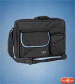 Lujosa maleta de Nylon para portátil, en formato apaisado, con múltiples posibilidades de uso. Realizada con nylon de 420 Deniers y materiales de alta calidad es resistente al agua. Dispone de múltiples compartimentos, algunos de ellos cerrados con cremallera, para llevar tanto accesorios personales como del portátil. Incorpora correa ajustable para llevarla al hombro y asa. En color negro y reborde en azul.