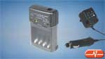 Cargador rápido de pilas recargables del tipo AA y AAA, para sobremesa, con transformador, y que incorpora un adaptador para coche y así poder cargar las pilas mientras se viaja. Dispone de función de refresco y descarga, recomendable para recuperar las pilas más antiguas.