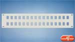 Panel frontal para armario Rack de 19” con 32 huecos tipo AMP para conectores hembra de RJ45, RJ12 y RJ10. Está disponible en dos unidades de altura.
