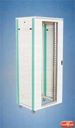 Rack de 19" con puerta frontal acrílica con marco, equipada con cerradura, con 4 perfiles desplazables de 19", puerta trasera en chapa de acero con llave y panel trasero inferior para permitir la entrada de cables. Los paneles laterales son desmontables y el techo posee ranuras de ventilación. Incluye cuatro patas regulables en altura, están disponibles en distintas alturas, desde 37U a 46U.