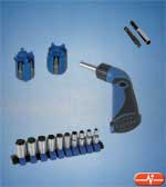 Juego de herramientas compuesto por un destornillador eléctrico angulado, en color negro y goma azul, y veintiuna piezas que posibilitan aflojar y apretar todo tipo de tuercas y tornillos.