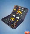 Práctico y útil estuche de herramientas de 9 piezas para uso eventual de la electrónica. Fabricado en plástico flexible y con cierre en cremallera. |